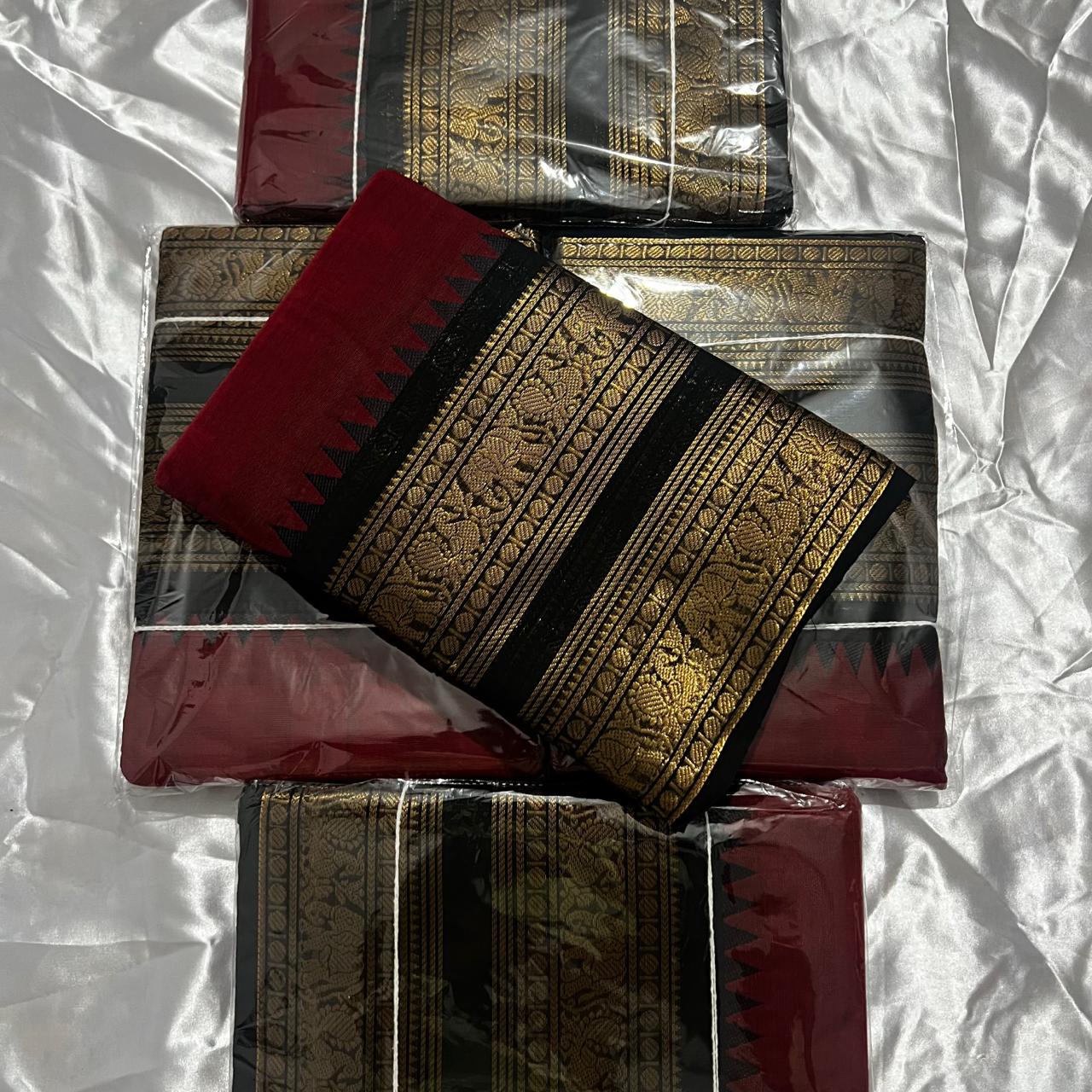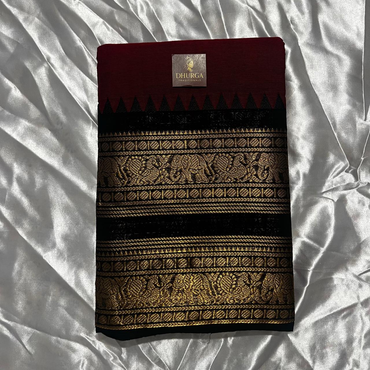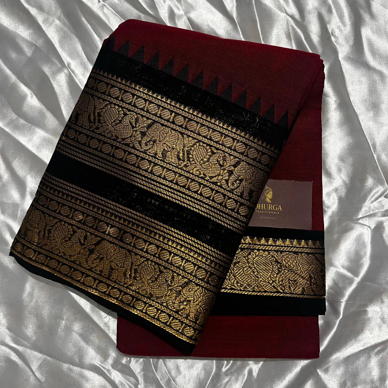 This elegant Kanchi cotton saree comes in a rich maroon base with classic black detailing, giving it a timeless and graceful look. Crafted from premium-quality Kanchi cotton, the fabric is soft, breathable, and perfect for both daily wear and special occasions.